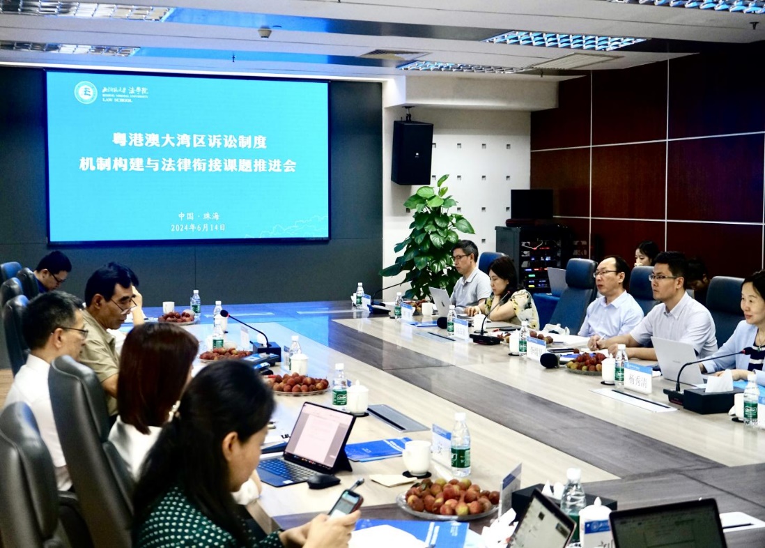 On June 14th, the project promotion meeting on "Mechanism Construction and Law Alignment for Litigation Systems in the Guangdong-Hong Kong-Macao Greater Bay Area" was successfully held in the third conference room on the second floor of the International Exchange Center of Beijing Normal University at Zhuhai. This project promotion meeting was organized by the Center on the Rule of Law and Development of Beijing Normal University at Zhuhai, with a total of sixteen experts and scholars participating. The meeting was chaired by Jing Hanchao, Vice President of the China Law Society and President of the Civil Procedure Law Research Association. The promotion meeting includes five units: conference speeches, presentations from various research groups, discussions and exchanges, project arrangements, and conference summaries.