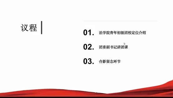 The meeting was divided into three agendas: introduction to the positioning of the Junior Youth League School of the Law School, a League lecture given by the deputy secretary of the Youth League Committee, and group photos.