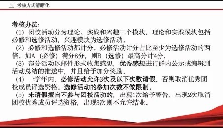 Then, Yang Qianwen led everyone to interpret the scoring criteria for the Junior Youth League School results one by one: the Junior Youth League School is divided into three sections: theory, practice and interest. The score of compulsory activities accounts for at least twice that of elective activities, and excellent reflections will be given extra points. She also emphasized that a League member may ask for leave no more than three times within a school year, otherwise he or she will be disqualified from selection as an outstanding member of the Junior Youth League School.