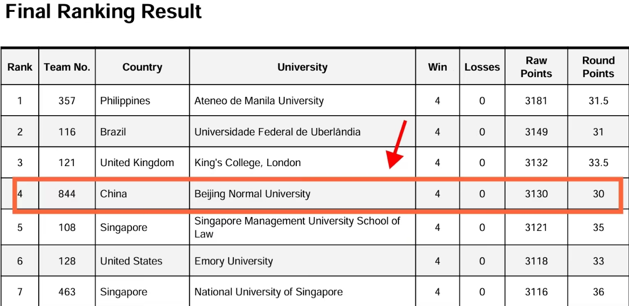 Figure 4: Beijing Normal University representative team ranking fourth in the world in the preliminary round