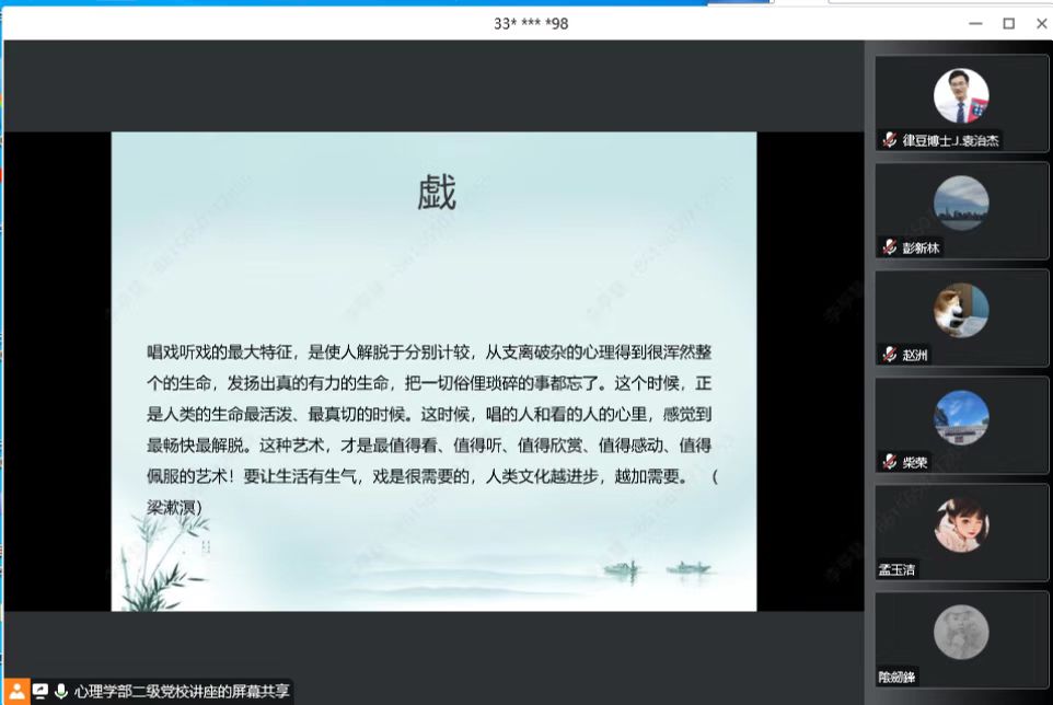 2023年5月10日下午, 成人玩具 党委和心理学部党联合举办二级党校讲座:《戏里的中华传统人文精神》。本次讲座由心理学部研究生第十三党支部承办,以线上线下结合的方式进行,主讲嘉宾为中国戏曲学院的刘小军教授,同时来自法学、心理、协同、环境、天文、核科学和数学学院的百余名同学师生党员和入党积极分子参加了本次讲座。