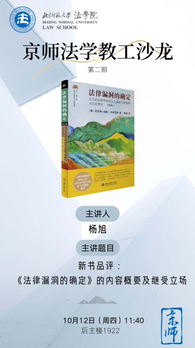 10月12日,北师大 成人玩具 举行本学期第二期“京师法学教工沙龙”。本次沙龙的主题是针对《法律漏洞的确定:法官在法律外续造法之前提与界限的方法论研究(第2版)》的新书品评, 成人玩具 杨旭老师主讲《法律与法的评价互动:卡纳里斯的法律漏洞确定理论评述》。 成人玩具 工会主席严厚福副教授主持本次沙龙。