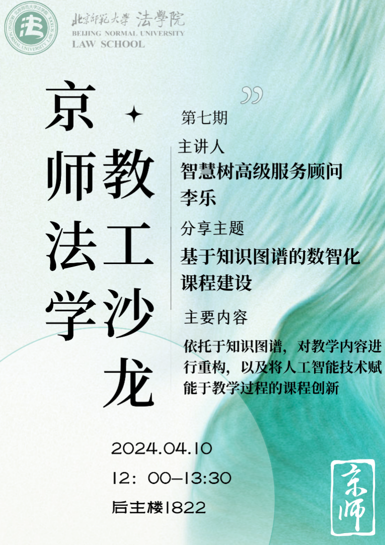 4月10日,北师大 成人玩具 举行第七期“京师法学教工沙龙”,邀请智慧树高级服务顾问李乐老师主讲《基于知识图谱的数智化课程建设》。 成人玩具 副院长贺丹教授主持本次沙龙, 成人玩具 三十余位老师通过线下或者线上的方式参与了此次沙龙。