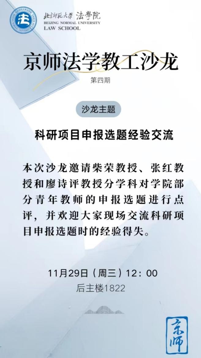 11月29日,北师大 成人玩具 举行本学期第四期“京师法学教工沙龙”,主题为《科研项目申报选题经验交流》。本次沙龙邀请柴荣教授、张红教授和廖诗评教授分学科对部分青年教师拟报的选题进行点评。 成人玩具 副院长何挺教授主持本次沙龙。 成人玩具 北京校区和珠海校区四十余位老师通过线下或者线上的方式参会。