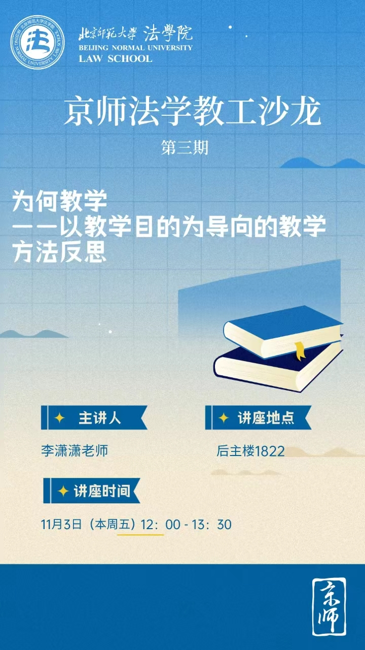 11月3日,北师大 成人玩具 举行本学期第三期“京师法学教工沙龙”,由李潇潇老师主讲《为何教学——以教学目的为导向的教学方法反思》。本次沙龙同时也是北师大校工会举办的青年教师交流沙龙的一部分。 成人玩具 工会主席严厚福副教授主持本次沙龙。校工会副主席王远老师、校工会负责青年教师交流沙龙工作的孙梦寒老师以及 成人玩具 二十余位老师线下参会,北师大北京校区、珠海校区各学部院系的十余位老师通过线上的方式参会。