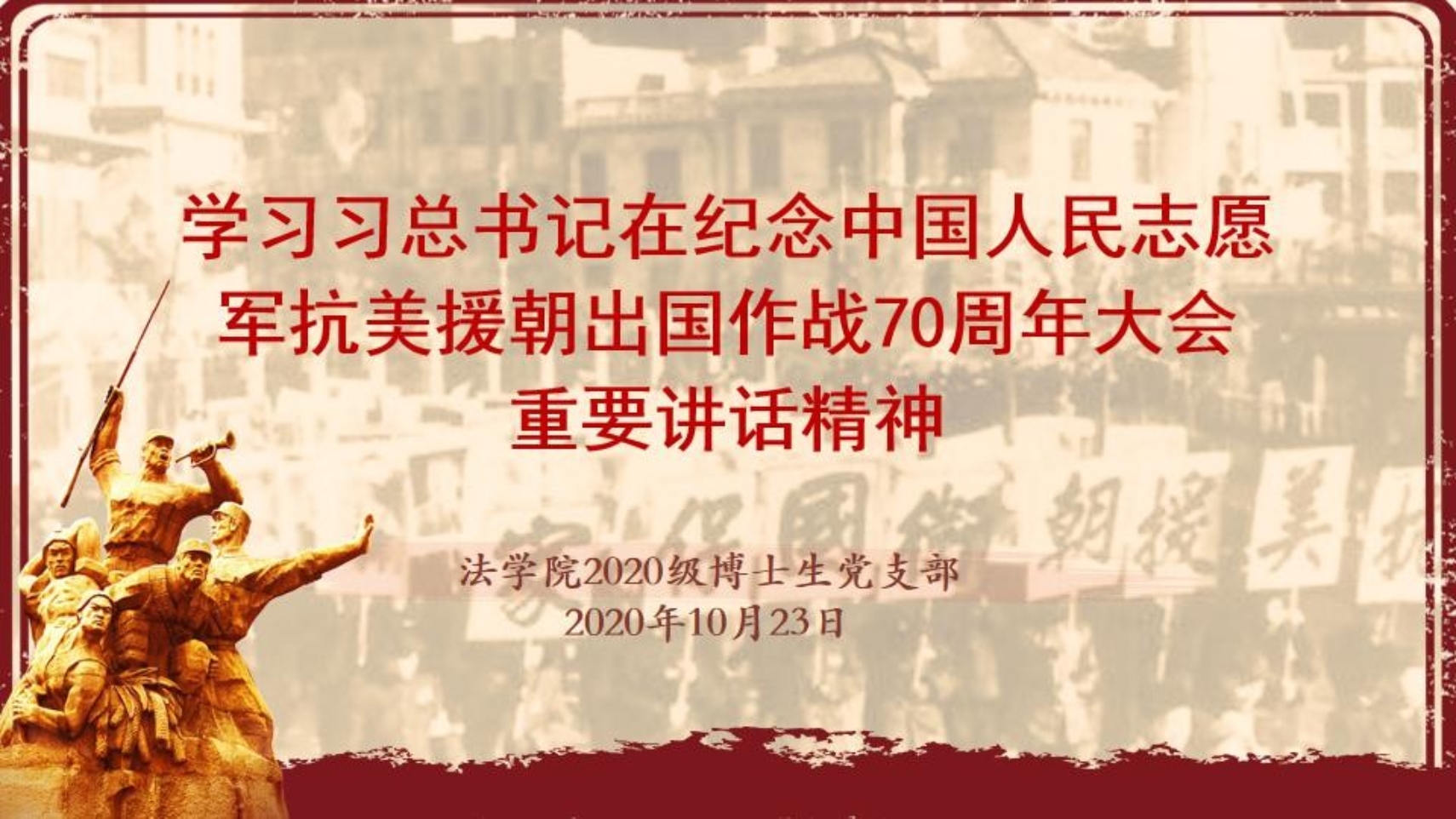 与会同志共同表示,在当前的国际形势下,我们要敢于斗争,善于从过去的斗争历史中吸取经验,从制度优势中汲取力量。今年是中国人民志愿军抗美援朝出国作战 70 周年,是“十三·五”规划收官之年,更是“两个一百年”奋斗目标的历史交汇年,站在这样的重要节点上,作为青年博士研究生,更要紧密团结在以习近平同志为核心的党中央周围,继续增强“四个意识”,坚定“四个自信”,坚决做到“两个维护”,以习近平新时代中国特色社会主义思想为指导,弘扬抗美援朝精神,认真学好本专业相关知识,为中国梦的胜利实现贡献力量。