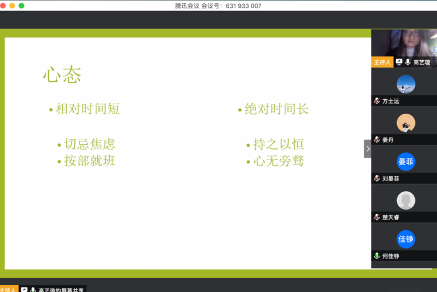 最后进行分享的是何佳铮同学,她主要从心态和知识储备两个方面展开,她认为法考的时间既短又长,虽然大家在复习过程难免会心态急躁,但还是希望大家能坚持如一的学习,心态是先决条件,种一棵树,最合适的时间是十年前,其次是现在,一定不要焦虑和担心自己复习的时间比较晚。她建议大家在复习的过程中一定要对知识点进行理解,理解是第一要务,平时可以多关注时事动态,培养自己利用法律思维分析问题的能力,一定要多做题,希望大家能放下过多的包袱轻装上阵,脚踏实地稳扎稳打,功到自然成。