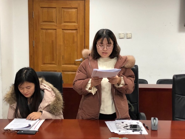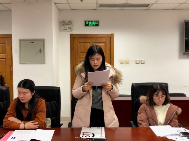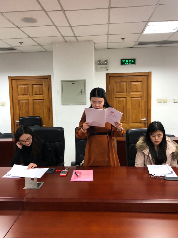 会议在全体成员面向党旗奏唱《国际歌》中庄严地拉开了序幕。首先,贾文雪同志宣读《入党志愿书》,汇报对党的认识、入党动机、本人履历、家庭和主要社会关系情况,以及需向党组织说明的问题。接着,贾文雪同志的入党介绍人都琦、吴阳阳同志分别发表意见,均认为贾文雪同志已基本符合党员条件,愿意介绍其加入中国共产党。侯撼岳、单婷、储琪同志也就贾文雪同志能否成为预备党员问题进行热烈讨论,纷纷表示贾文雪同志对党拥有正确认识、入党动机端正,建议支部接收其为预备党员。之后,组织委员吴阳阳代表支部委员会报告对发展对象贾文雪同志的审查情况。与会正式党员进行无记名投票表决,由纪检委员赵学敏同志宣读支委会草拟的支部大会决议,贾文雪同志的表决结果为14票赞成、0票反对、0票弃权,支部同意接收其为中共预备党员。