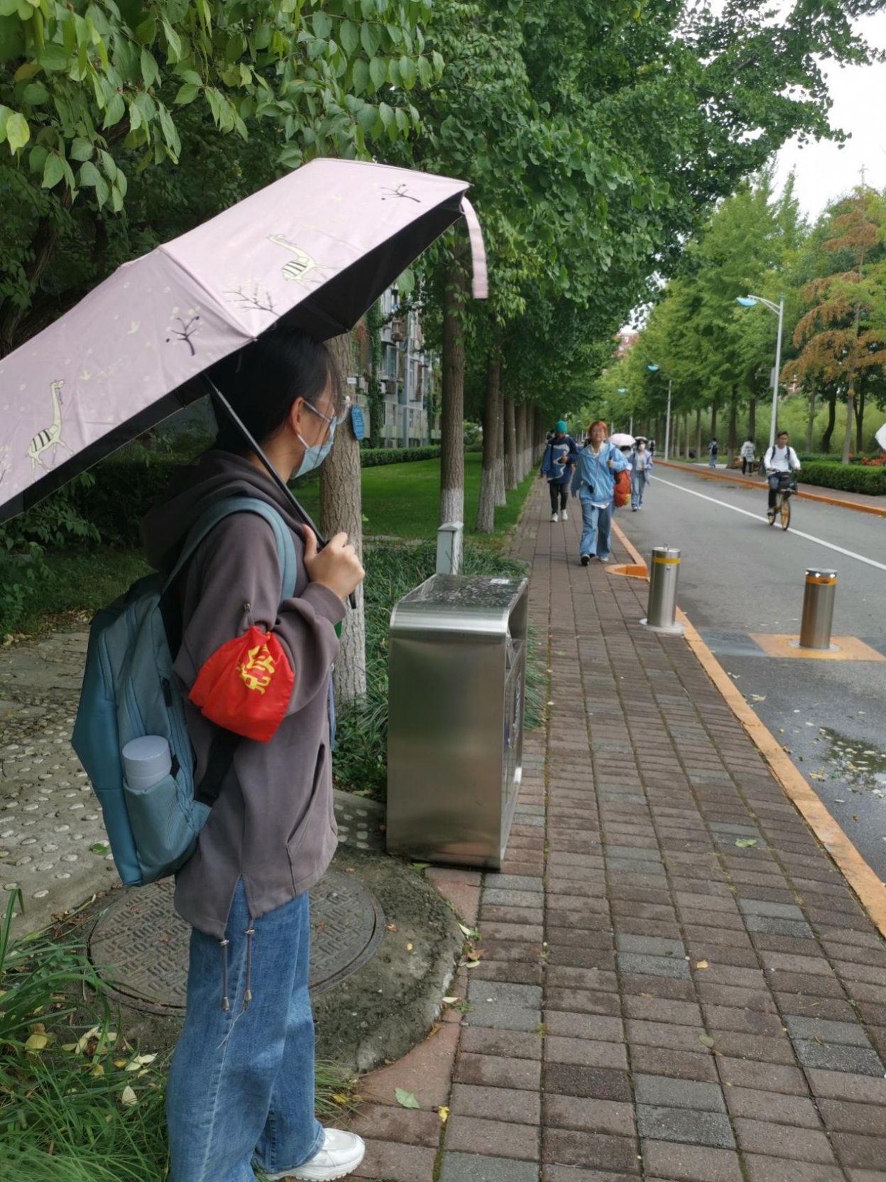 我负责的是校园主干道,其实,在课间的时候人流量挺大的,而且有一部分同学没有戴口罩,还是很危险的。这时候需要志愿者提醒同学佩戴口罩并给忘记戴口罩的同学发放口罩。一方面,可以从客观上改善人流大密集时的防疫情况,另一方面,同学们经过提醒后也能提高防范意识。