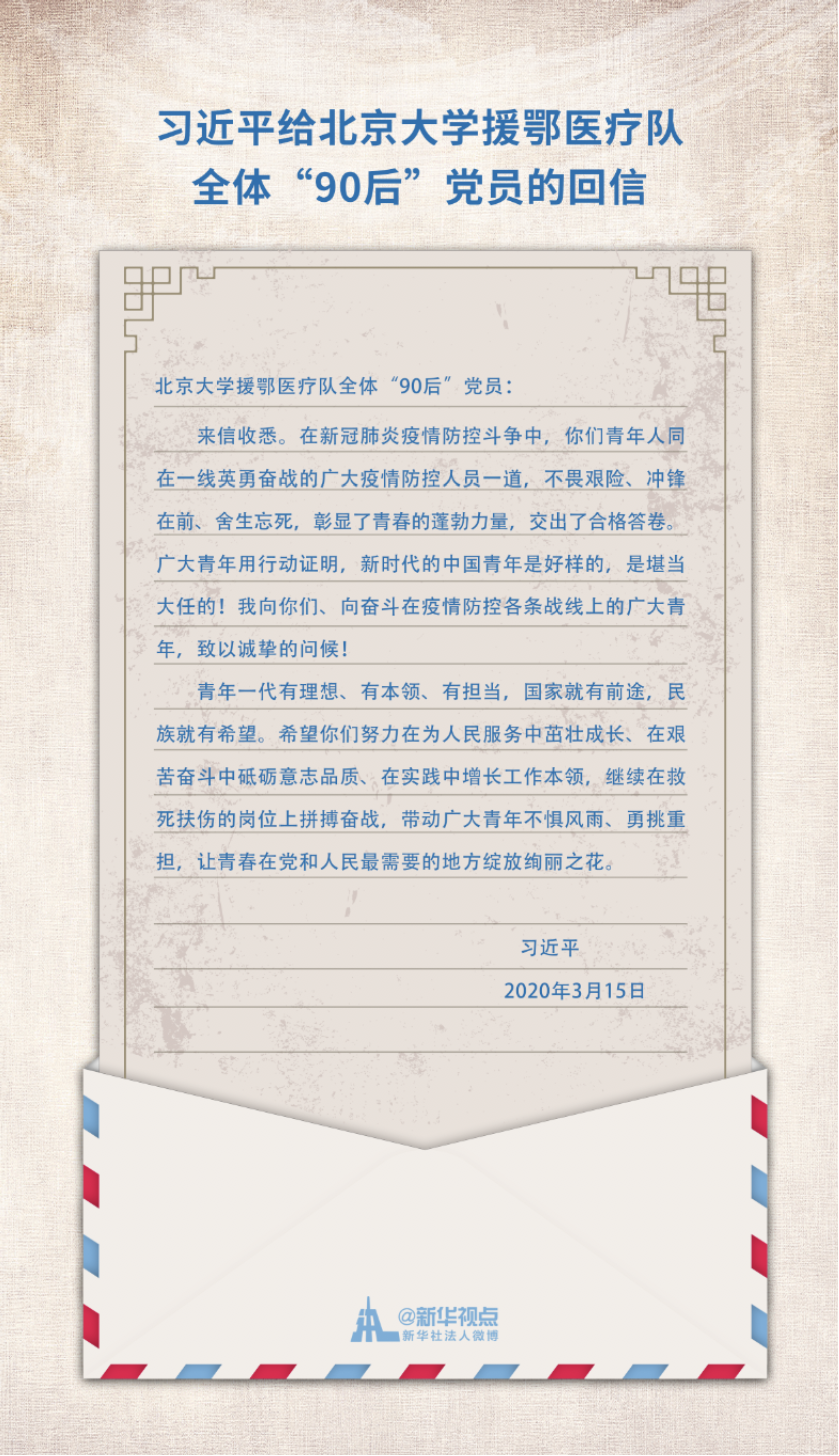 2020年3月15日,习近平总书记给北京大学援鄂医疗队全体“90后”党员回信,充分肯定了在一线英勇奋战的广大疫情防控人员特别是青年群体作出的重要贡献,并向他们和其他奋斗在抗疫战线的广大青年致以诚挚的问候,习总书记还在信中勉励广大青年要继续发挥不怕风雨,勇挑重担的精神,不断在实践中磨练自己,在为人民服务的过程中茁壮成长。