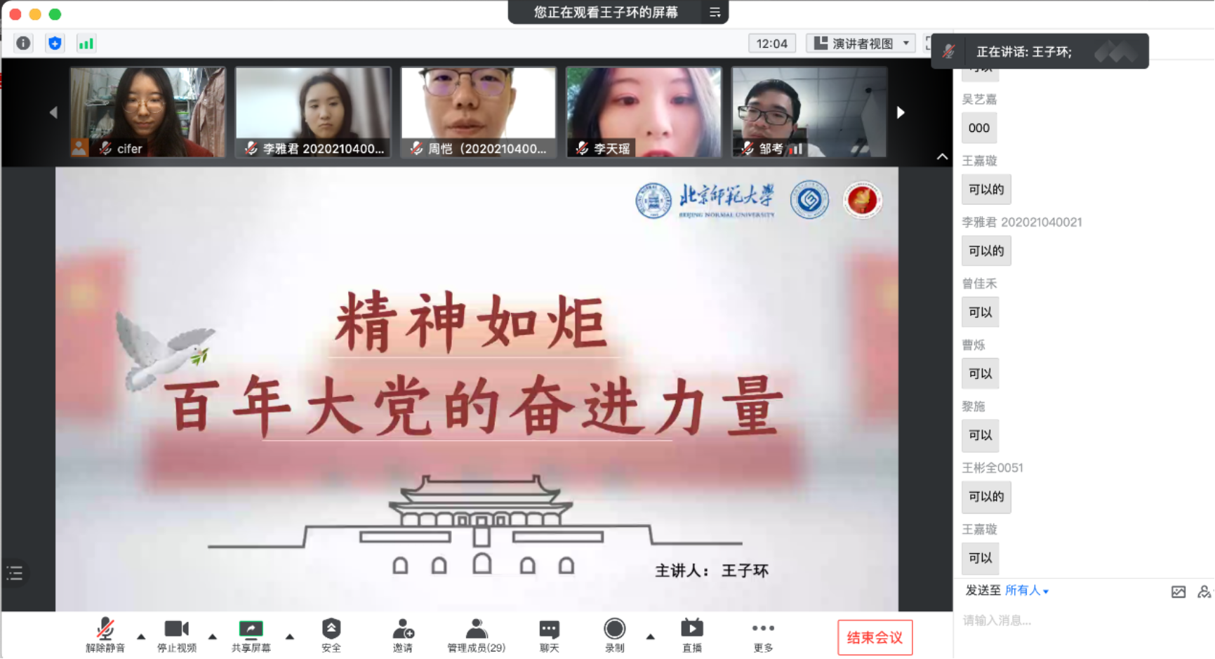 在中国共产党成立100周年之际,重温中国共产党的精神成长历程以汲取智慧和力量指导新实践,是一件具有重大意义的事情。为此, 成人玩具 2020级学硕第二党支部于2021年5月8日晚7时30分,邀请马克思主义学院的王子环同志进行以“精神如炬,百年大党的奋进力量”的主题宣讲,开展了线上专项学习活动。此次活动由党支部书记李凌智同志进行主持,王子环同志主讲,本支部16名党员与16名入党积极分子均参与了本次活动。