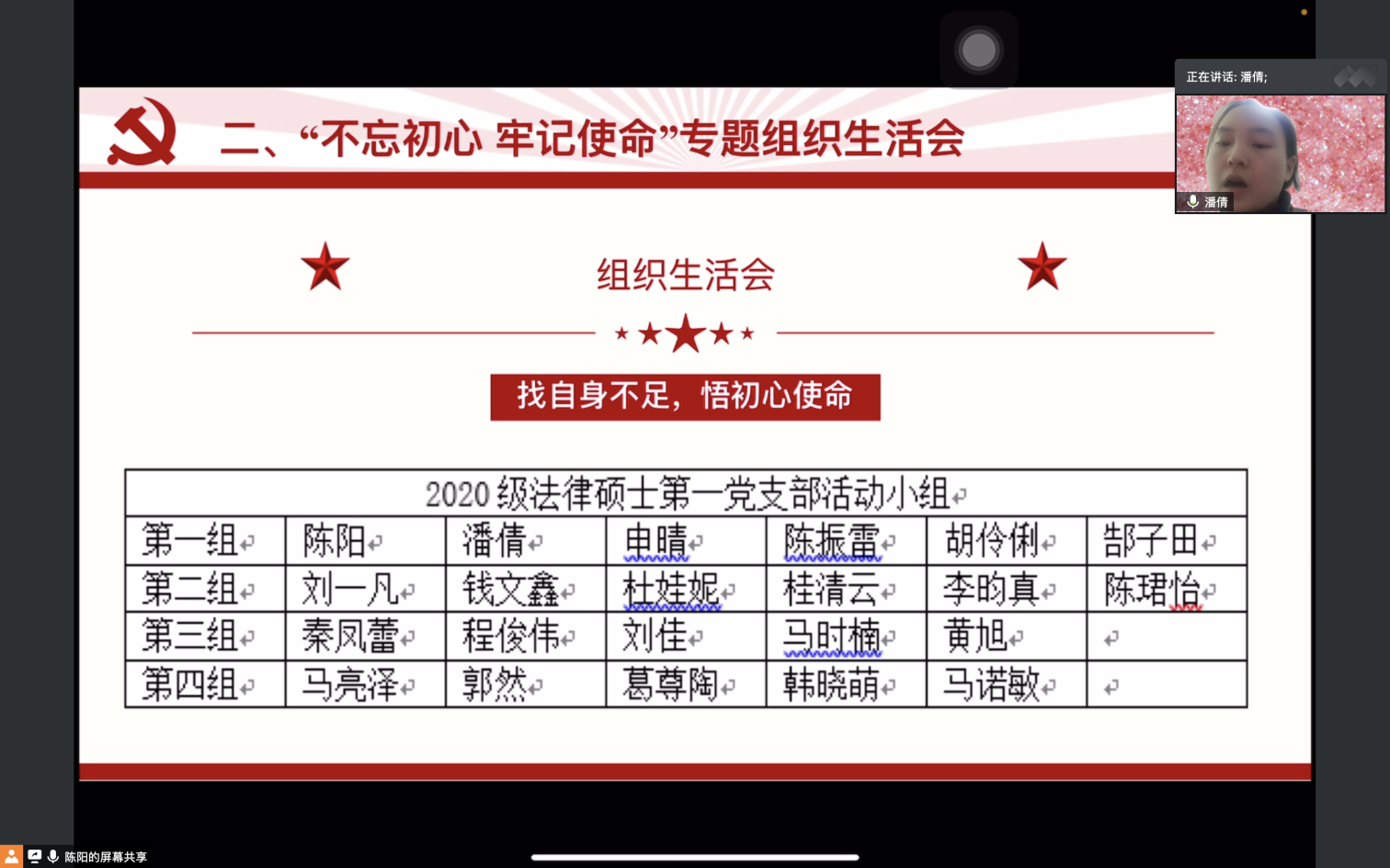 2021年3月3日, 成人玩具 2020级法硕第一党支部通过腾讯会议组织开展了支部全体党员大会暨“不忘初心,牢记使命”专题组织生活会,本次会议共有22名正式党员参加,会议由党支部书记陈阳主持, 成人玩具 党委副书记郭雅婷老师莅临本次会议。