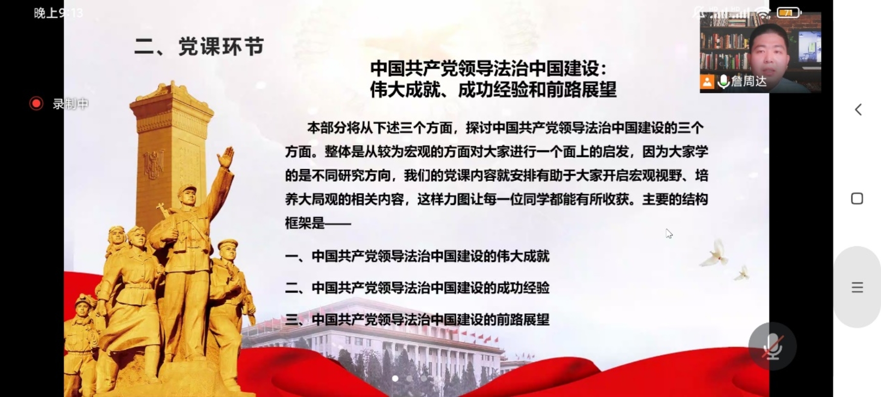随后,詹周达同志围绕“中国共产党领导法治中国建设:伟大成就、成功经验和前路展望”这一主题为同志们带来了一场主题党课。此次党课以习近平法治思想为指导,主要从回顾中国共产党领导法治中国建设所取得的伟大成就、总结中国共产党取得法治中国建设举世瞩目成就的经验以及未来中国共产党领导法治中国建设取得更大成就的方向与道路三个方面展开。本次党课主要是从宏观方面对同学们进行启发,由于支部内各位同志的学习研究方向各有不同,因此党课内容主要致力于启迪宏观视野、培养大局观念,力图使每一位同学在党课学习中有所进益。