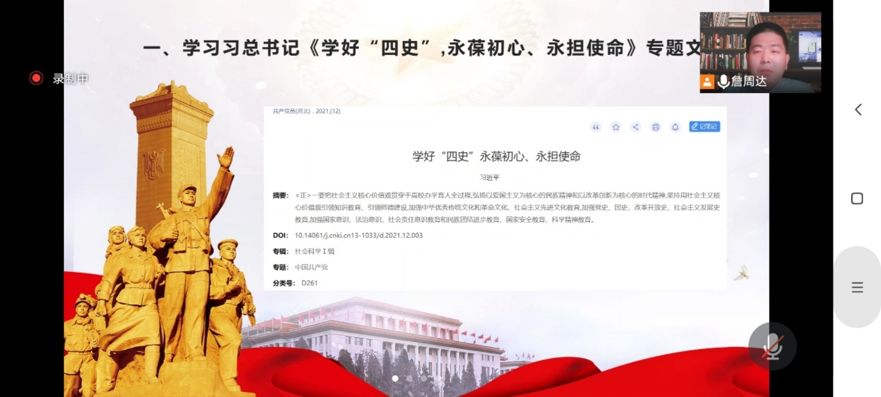 会议伊始,支部全体成员共同学习了习近平总书记《学好“四史”、永葆初心、永担使命》专题文章。支部书记詹周达同志强调在中国共产党建党百年的伟大历史时刻,我们应当坚持不忘初心、牢记使命,积极贯彻习总书记要求,通过阅读学习习总书记重要文章成果,认真学习党史、新中国史、改革开放史和社会主义发展史。支部同志们表示将在日常学习过程中,认真持续学好党史、“四史”知识,树立正确的历史观,自觉抵御历史虚无主义。