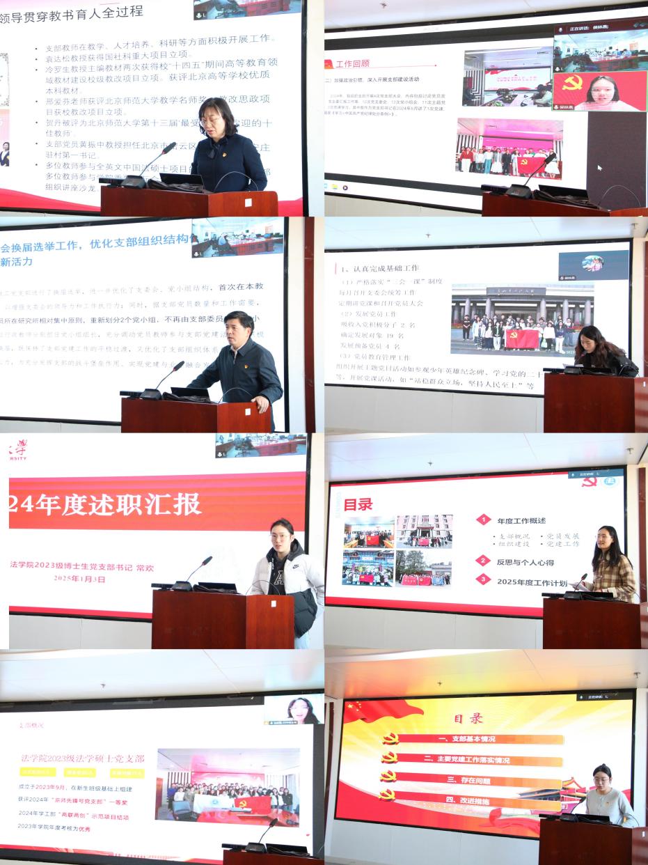 各支部书记采用线上线下相结合的方式,围绕支部的基本情况、政治建设、组织建设、宣传工作及作风建设等方面,介绍了本支部的重点与特色工作,回顾了 2024 年的成果,同时反思了工作中的不足及整改方向。其中,教工二、三支部重点强调,要加强思想政治建设,需把学习贯彻党的二十届三中全会精神与教学科研育人工作有机结合起来。通过引导教师党员积极申报学校课程思政建设项目,以及联合学生党支部开展丰富多彩的党建共建活动等形式,切实落实立德树人根本任务,将党的领导贯穿教书育人全过程。学生党支部基于过去一年“联学联建”“两联两创”等项目的成果与经验,表示在新的一年要继续加强坚持政治引领,全面落实“三会一课”;利用专题宣讲、红色参观、党课讲授、学习研讨、现场教学、材料自学等方式丰富党建活动形式与内涵;通过广泛宣传打造品牌形象,形成党员风采展示窗口,发挥党员先锋模范作用。