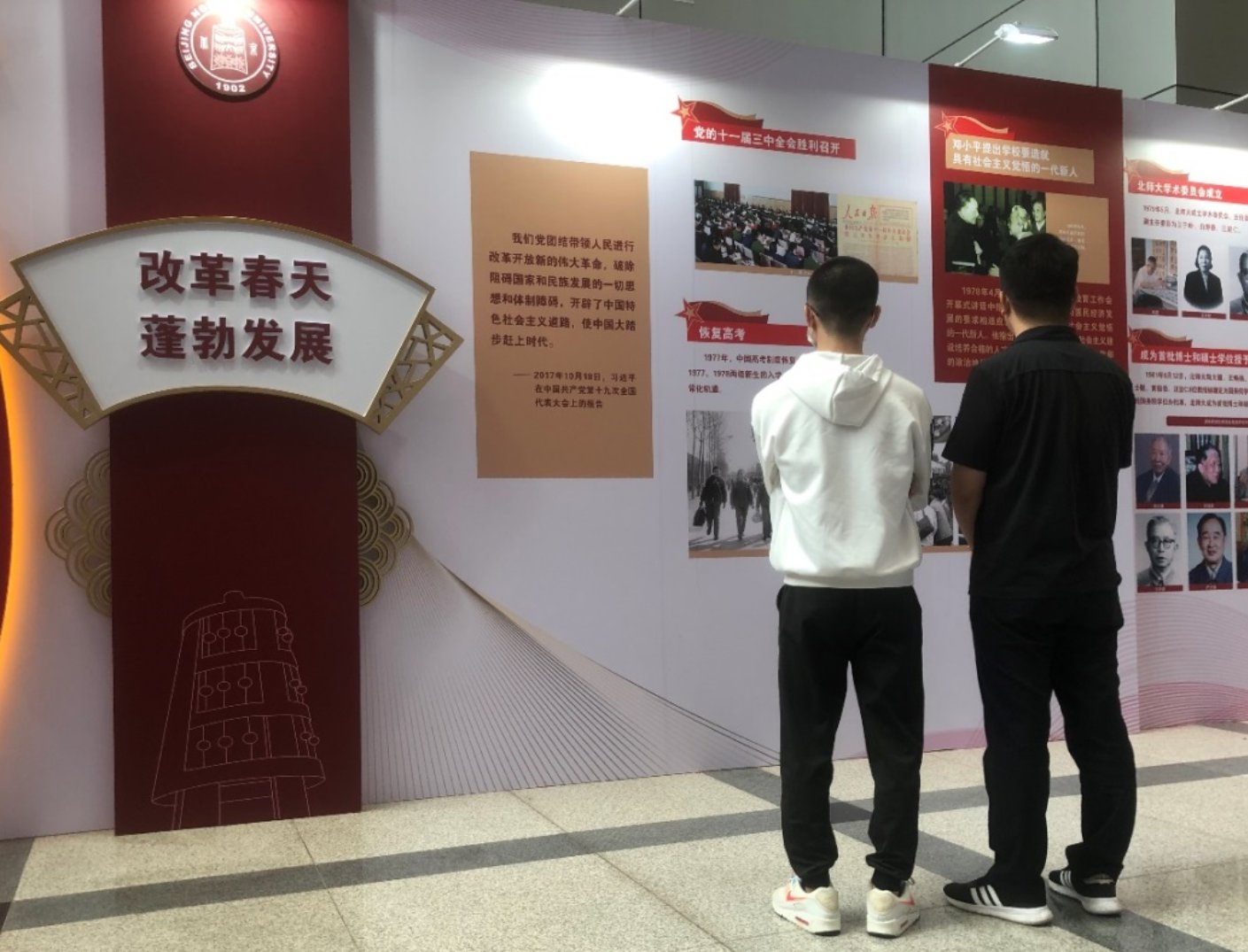 展览分为“红色基因 薪火相传”、“不懈探索 砥砺前行”、“改革春天 蓬勃发展”、“新时代 新征程”四个部分,以新民主主义革命时期、社会主义革命和建设时期、改革开放和社会主义现代化建设新时期、中国特色社会主义新时代四个历史时期为时间轴,用史料还原重大历史事件,展示北师大的红色基因,传承至今的红色故事,弦歌不辍、坚守办学初心的红色精神。