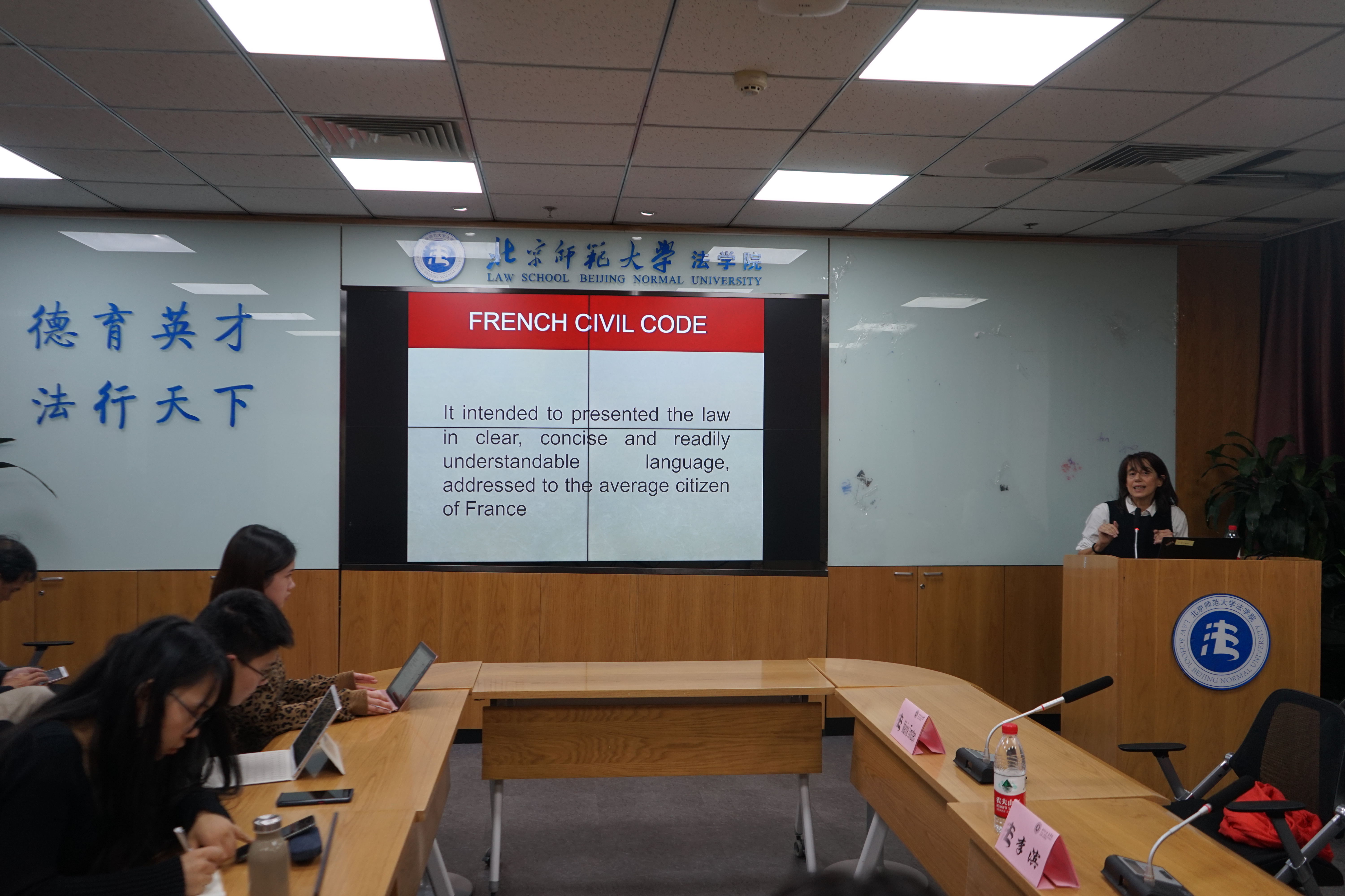 其次,教授从历史原因、不同语言对法律行为理解的异同等方面比较分析了德国、法国及中国法律行为的来源,对各国的民法典进行了剖析。谈及《德国民法典》时,Marina Timoteo教授认为其是法学者研究成果的高度表达,有很强的理论性,支撑起整部民法典的体系。