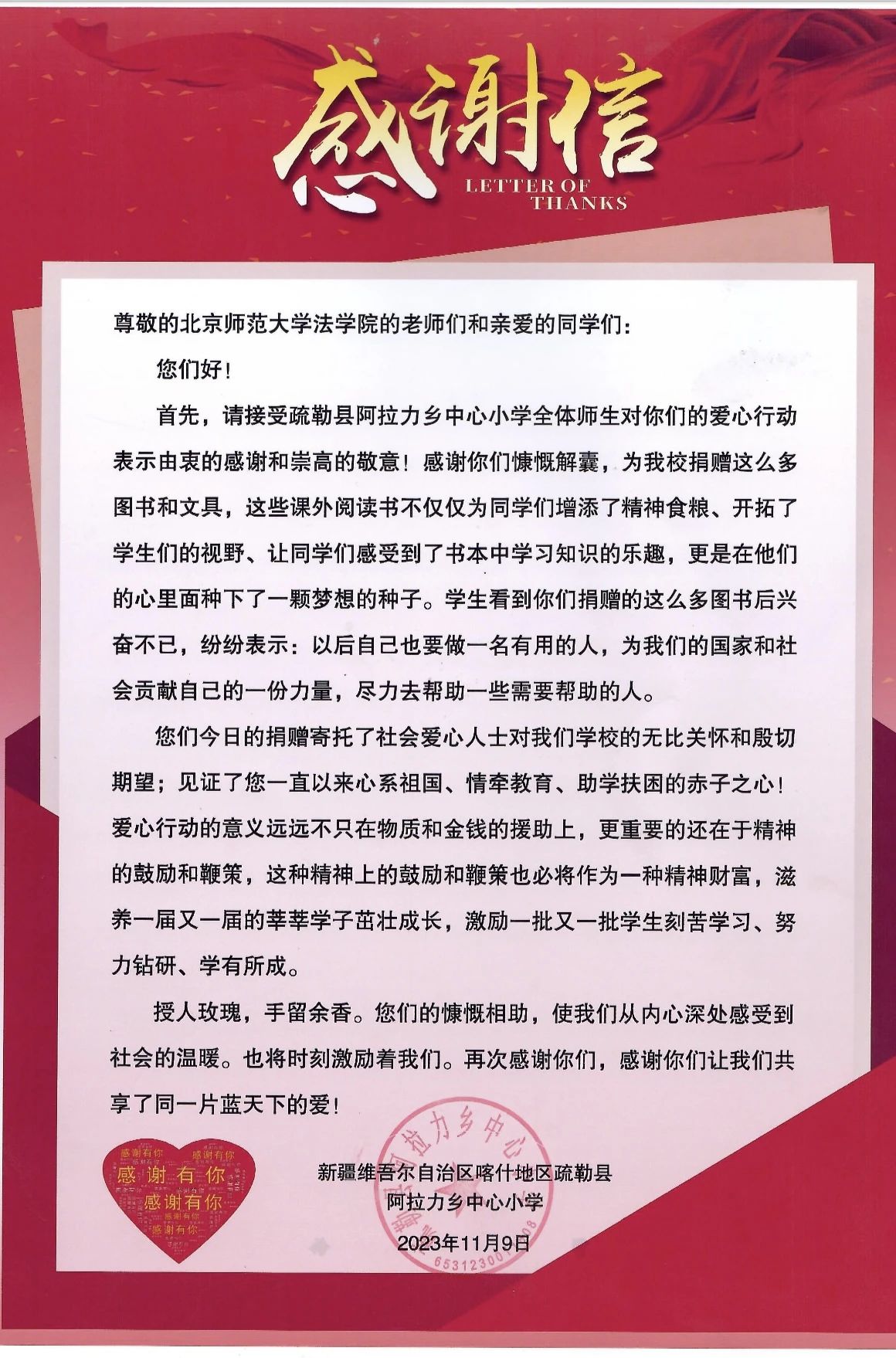 自2022年“助力南疆 法育未来”爱心助学物资捐赠活动后,成人玩具 再次举办2023年“捐书留香 再会南疆”向新疆喀什地区疏勒县阿拉力乡小学捐赠活动。近期,这些来自首都北京的物资满载着温暖和关心、祝福和寄望抵达目的地,为孩子们的秋冬学期带来了浓浓的暖意。