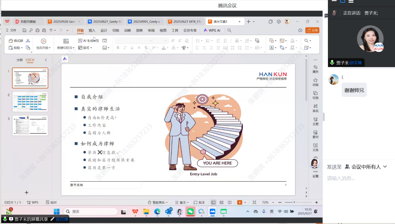 第二位分享的嘉宾是任职于汉坤律师事务所知识产权部的贾子禾师姐,师姐主要围绕“真实的律师生活”和“如何成为律师”两方面进行了分享。首先,师姐向大家介绍了律师工作拥有高度自由性的同时也意味着休息时间的不固定,在内卷的法律市场下律师常常面临着较大工作压力。至于要如何成为律师,师姐点明当今法律市场实质上是信息战,建议同学们广泛搜集信息、找寻自己适合的岗位。如果想要进入心仪的律所,简历必然是第一步,而学业成绩和实习经历是让简历“脱颖而出”最重要的部分,基于以上师姐建议同学们要努力提升学业成绩、多“刷”优质实习。最后,师姐以业内人视角着重强调了投递简历的注意事项,如排版美观、避免语病错字、扬长避短等。