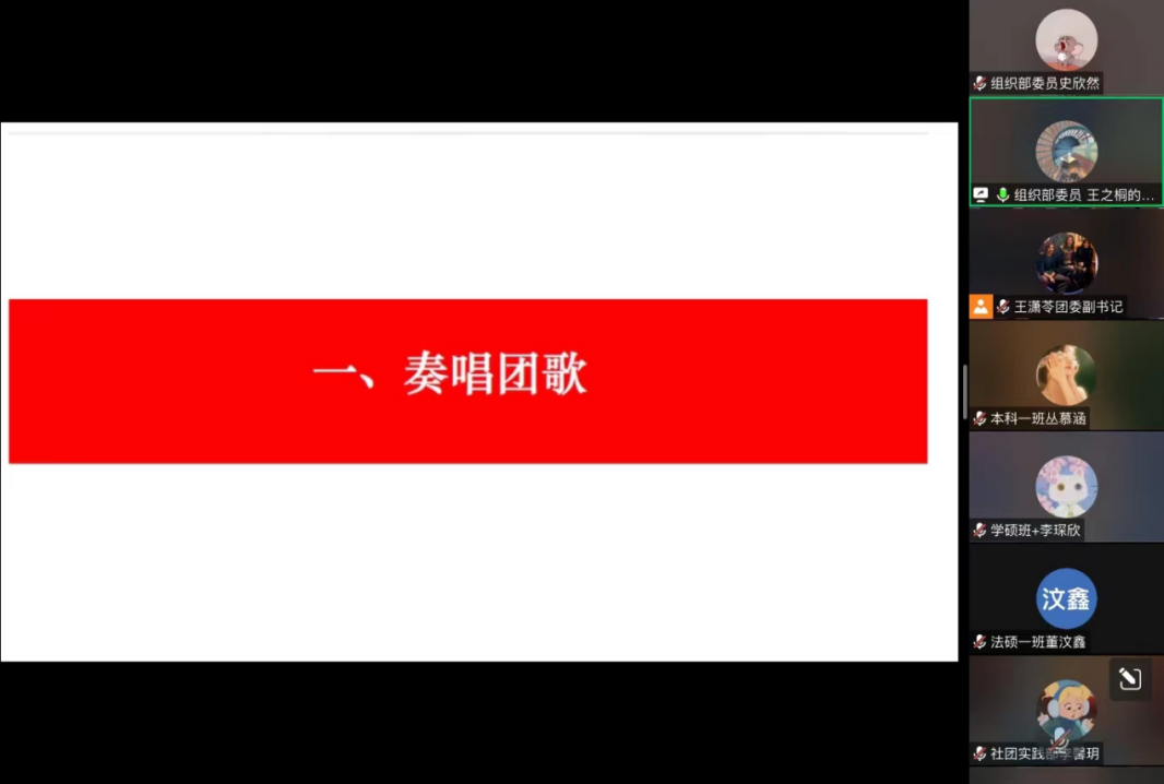 首先,王潇苓对各位新生团务负责人的参会表示欢迎,并强调了新生团组织关系转接等相关团务工作的重要性。大会进入第一项:奏唱团歌。