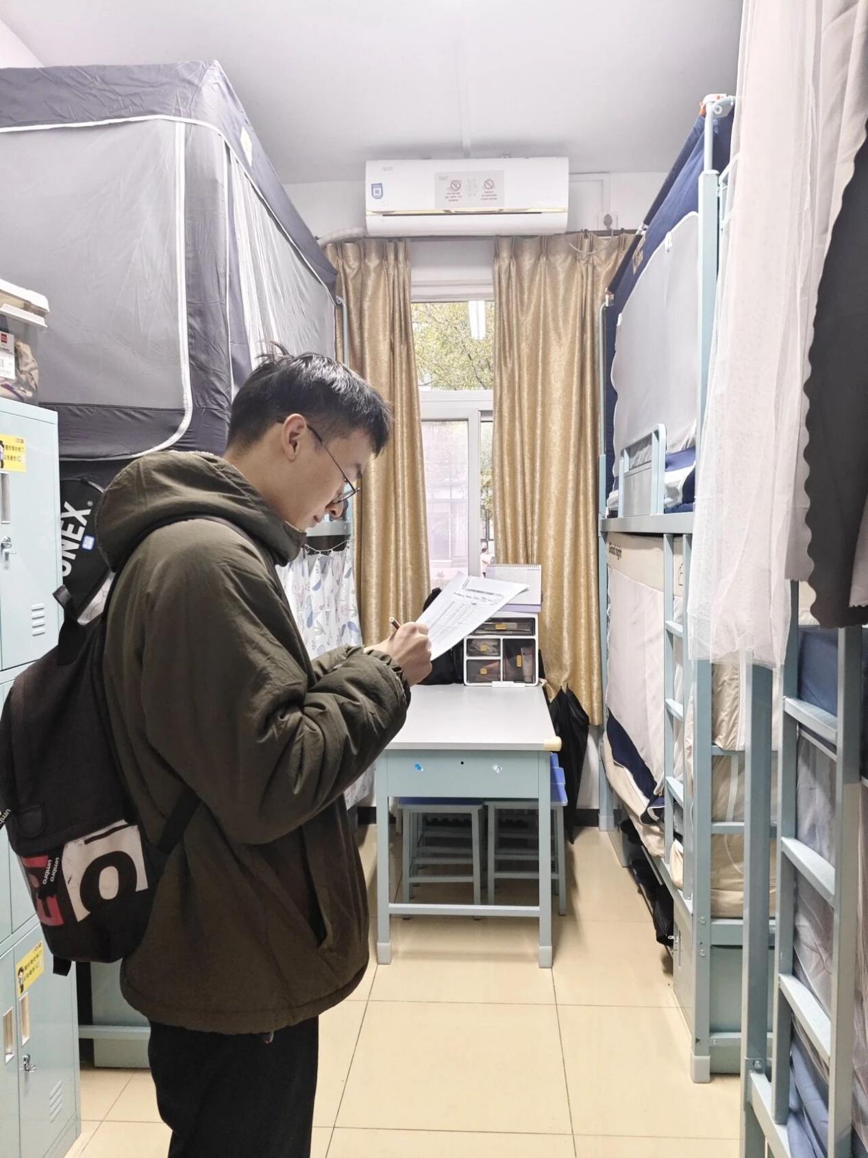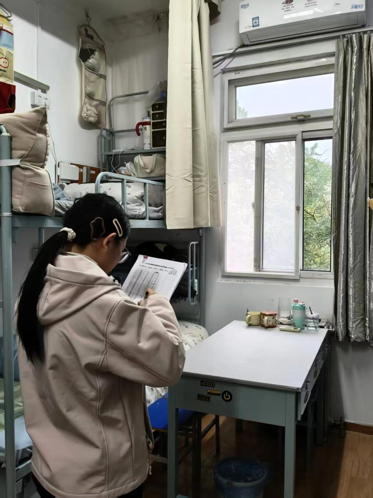 检查环节,老师及宿舍长骨干细致排查宿舍用电安全与消防设施状况,对插线板过载、杂物堆放等隐患及时提醒整改,强调宿舍安全的重要性。针对本科生,老师对照军训内务标准,逐一查看床铺整理、物品摆放、地面清洁等情况,表扬被褥叠放规范、桌面整洁的宿舍,对不足之处现场指导整改,鼓励同学们以军训为契机养成良好的生活习惯。此外,王皓月老师及宿舍长骨干们还依据学院《文明宿舍评分标准》对各宿舍卫生环境进行综合评分,鼓励同学们积极参与文明宿舍评选,以宿舍为单位凝聚集体力量,共同打造兼具安全保障与人文温度的住宿空间。
