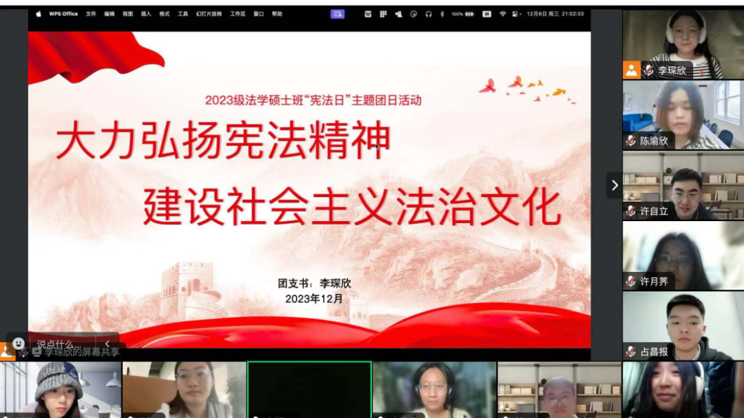 12月6日晚,2023级法硕2班团支部组织召开了“学习习近平法治思想,推进宪法理论和宪法实践创新”的宪法主题团日活动。本次会议采用线上形式,由团支书梅笑宇主持,内容包括宪法日介绍、习近平法治思想学习以及团员主题讨论三个环节。在主题团日中,同学们深刻理解了习近平总书记作为全党和党中央的核心,高瞻远瞩、审时度势,根据新时代中国特色社会主义法治建设的新特点,就全面依法治国提出了一系列新理念新思想新战略,最终形成了习近平法治思想。这一重要思想包含的一系列关于宪法的重要论述,构成了一整套科学完备的宪法理论体系,标志着我们党对宪法的认识和实践达到了一个新的高度。