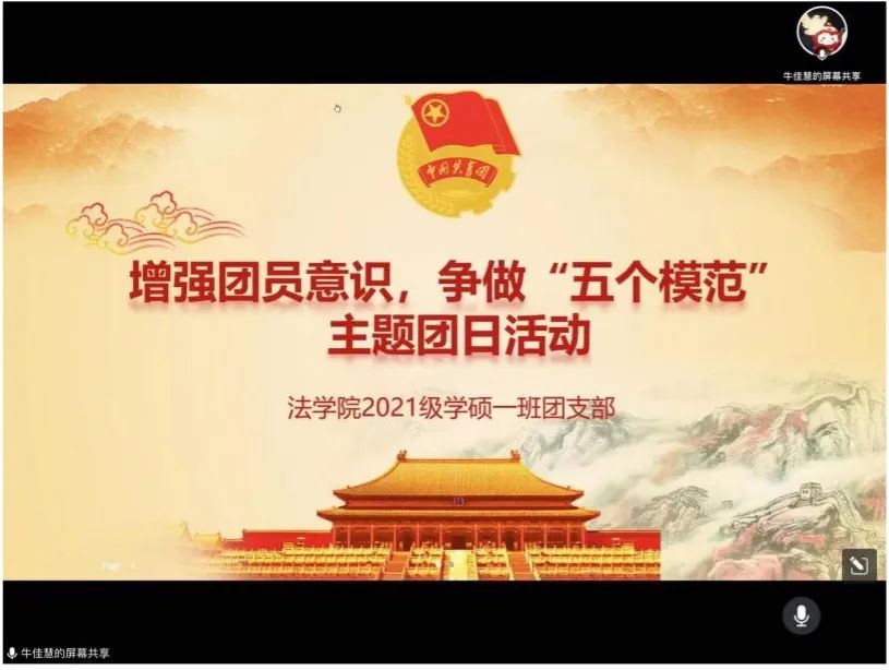 5月13日晚, 成人玩具 2021级学硕一班线上召开了以“增强团员意识,争做‘五个模范’”为主题的团日活动。本次活动由团支书牛佳慧同学主持。活动由五项内容组成,分别是政治生日会、理论学习会、线上观展、主题团课以及实践活动分享。全体参会团员一齐合唱团歌,重温入团誓词,参会同学交流分享了各自的入团初心及入团以来的心得感受。全体同学共同对团章进行了回顾,并学习了习近平总书记在庆祝中国共产主义青年团成立100周年大会上的讲话。随后,同学们一同进入了线上展厅,参观了 成人玩具 青年运动主题展,一同感受了变革图强、育人兴邦梦想的一代代北师大先进青年留下的青春业绩。在第四个环节——以回顾党的青年运动史为主题的团课上,参会同学们分享了自己观展的心得感受。