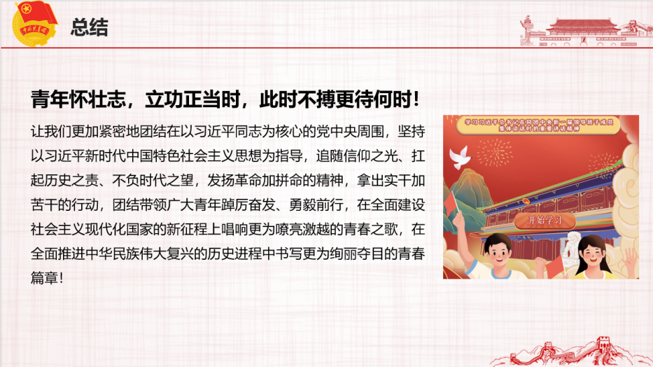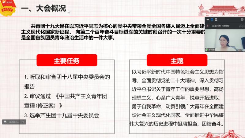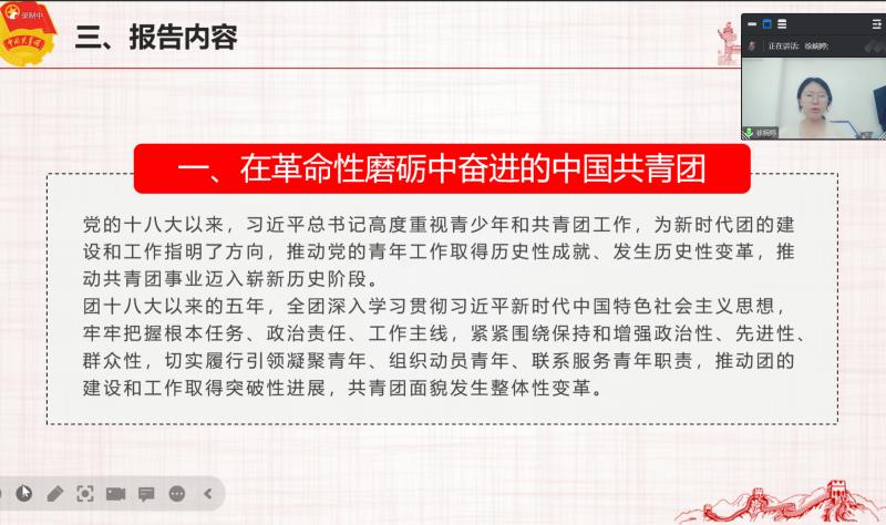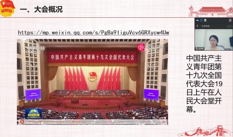 最后,学习团十九大报告的主要内容。中国共产主义青年团第十九次全国代表大会报告全面总结了在以习近平同志为核心的党中央坚强领导下共青团过去五年的工作,阐明了新时代中国青年的使命担当,强调了新时代共青团工作的根本遵循,对未来五年共青团建设和工作作出部署,充分体现了党的要求、反映了青年期望,是当前和今后一个时期共青团工作的重要指导性文件。