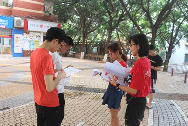 结束在法院的实践活动,三名队员冒着接近40度的高温,来到人群聚集的广场,在这里发放问卷,我们希望在人民群众中了解人民陪审员制度的实施情况。大多数市民都接受了我们的问卷调查,大约人均花费5分钟,都认真填完我们的问卷。也有不少市民,虽然从未听过人民陪审员制度,但对其十分感兴趣,在我们的解释下,在对人民陪审员制度有些许了解的情况下,也认真完成了我们的问卷。甚至有些市民对于人民陪审员制度的改进提出了自己独特的建议。