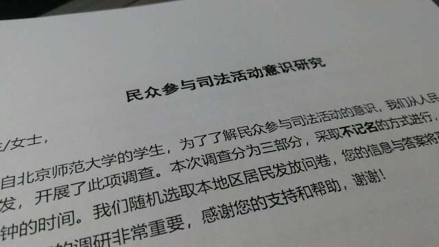 当然,为了调研对象的多样性,我们调研的地点并不局限于司法机关,我们还去公园、商场等地点进行发放问卷。在这些地点进行调研的过程中,我们获益良多,也更加了解人民陪审员制度在普通老百姓心中的朴素印象,启发我们对于人民陪审员制度,不仅仅要从一个法律专业的角度去考虑,还要从一个普通人的角度去看待人民陪审员制度可能发挥的作用。