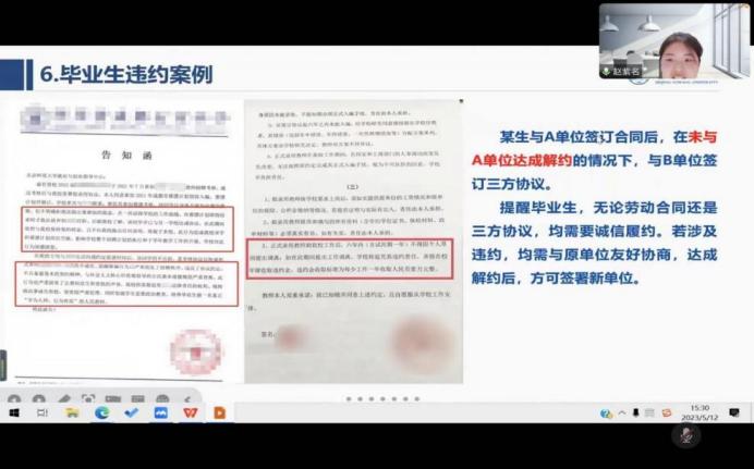 赵老师提醒毕业生们一定不要出现违约问题,毕业生就业需诚信,拟违约毕业生应与原签约单位进行友好协商,取得原单位的同意并获得解约函,不能在签约过程中对任何一方存在欺瞒现象。