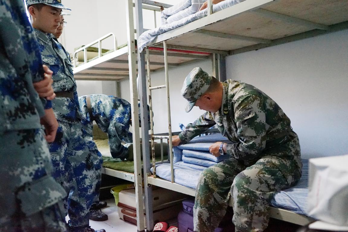 下午两点,军训的第一项活动即学习内务整理,“出门看队列,进门看内务”,内务整理是戒懒戒散的第一步,教官认真示范,学生们认真听学,很快成人玩具 新生所在宿舍变得干净而整洁。随即,学生们到达训练场开始了他们第一天的训练。