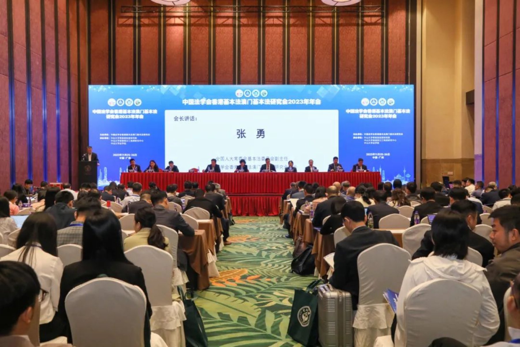 中国法学会副会长郑淑娜、中山大学党委副书记刁振强、广东省法学会专职副会长兼秘书长金艳、中山大学粤港澳发展研究院院长何俊志出席年会并分别致辞,全国人大常委会港澳基本法委员会副主任、中国法学会香港基本法澳门基本法研究会会长张勇作了讲话,中山大学粤港澳发展研究院首席专家郭天武主持开幕式。