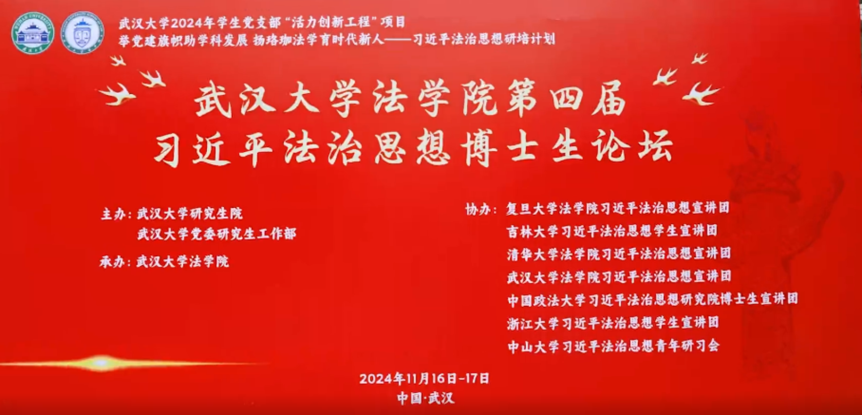 11月16日至17日,武汉大学 成人玩具 第四届习近平法治思想博士生论坛在 成人玩具 模拟法庭成功举办。本论坛由武汉大学研究生院、武汉大学党委研究生工作部主办,武汉大学 成人玩具 承办,复旦大学 成人玩具 习近平法治思想宣讲团、吉林大学习近平法治思想学生宣讲团、清华大学 成人玩具 习近平法治思想宣讲团、武汉大学 成人玩具 习近平法治思想宣讲团、中国政法大学习近平法治思想研究院博士生宣讲团、浙江大学习近平法治思想学生宣讲团、中山大学习近平法治思想青年研习会参与协办。