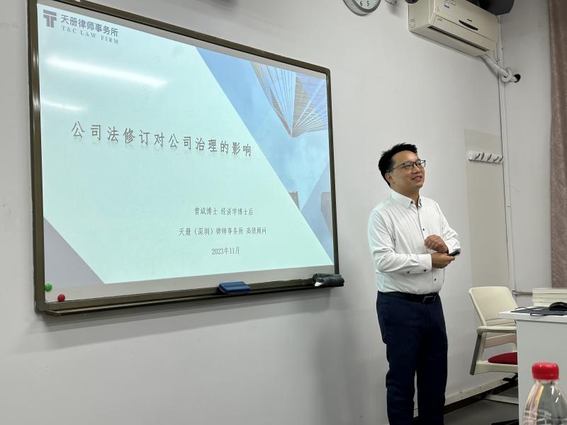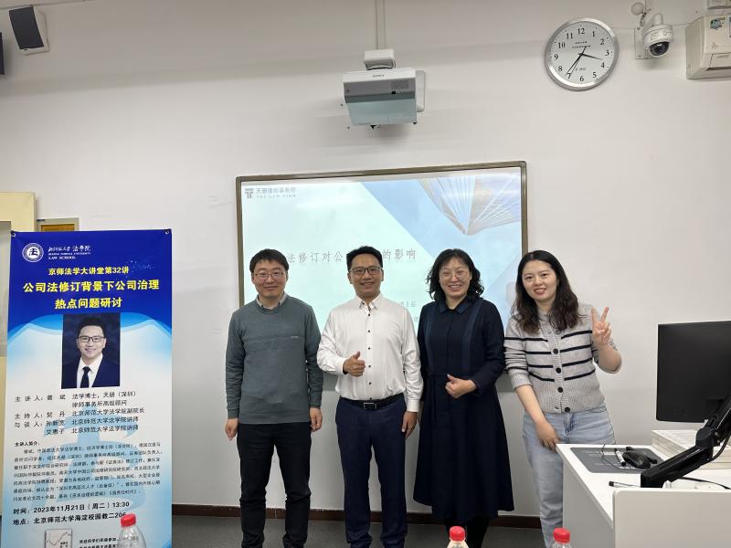11月21日下午,成人玩具 “京师法学大讲堂第32讲”于海淀校园教二206顺利举行。本次讲座主题为“公司法修订背景下公司治理热点问题研讨”,由天册(深圳)律师事务所高级顾问曾斌博士主讲。成人玩具 贺丹老师主持讲座;孙新宽老师、艾惠子老师与谈。