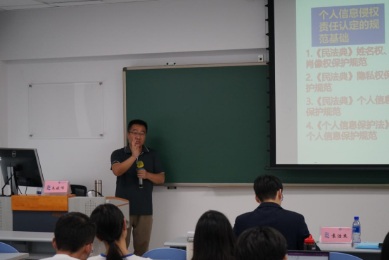 提问环节,刘雨旋同学就外卖平台中对于骑手个人行踪信息的使用及其侵权可能性等问题提出了疑问,朱晓峰教授给予了耐心解答,并对个人信息与数据产权的协调问题予以补充论证。