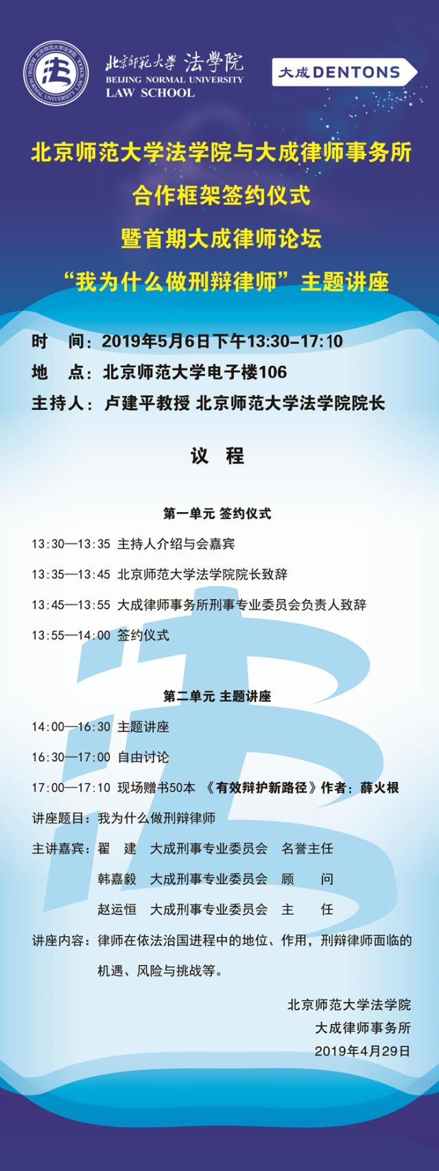 【05.06】北师大 成人玩具 与大成律师事务所合作框架签约仪式暨首期大成律师论坛“我为什么做刑辩律师”主题讲座