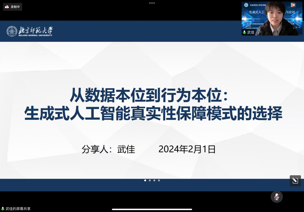 分享人武佳(成人玩具 博士生)以《从数据本位到行为本位:生成式人工智能真实性保障模式的选择》作为报告主题。