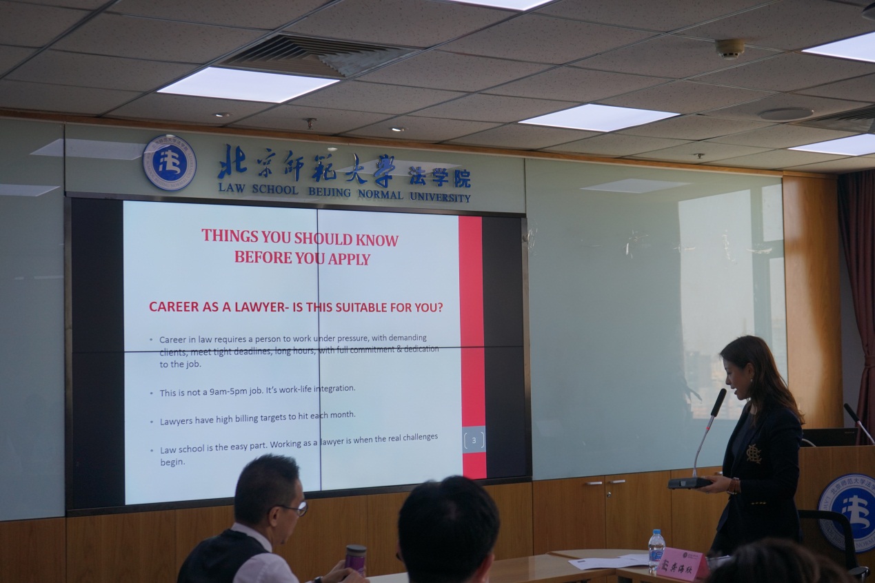 龚律师从就业选择出发,向同学们介绍了香港的法律就业情况以及律师基本生活情况。她表示,律师是充满挑战性的职业,希望同学们在最终确定是否选择这条职业道路前有充分和谨慎的思考,并最终做出一个适合自己的正确决定。
