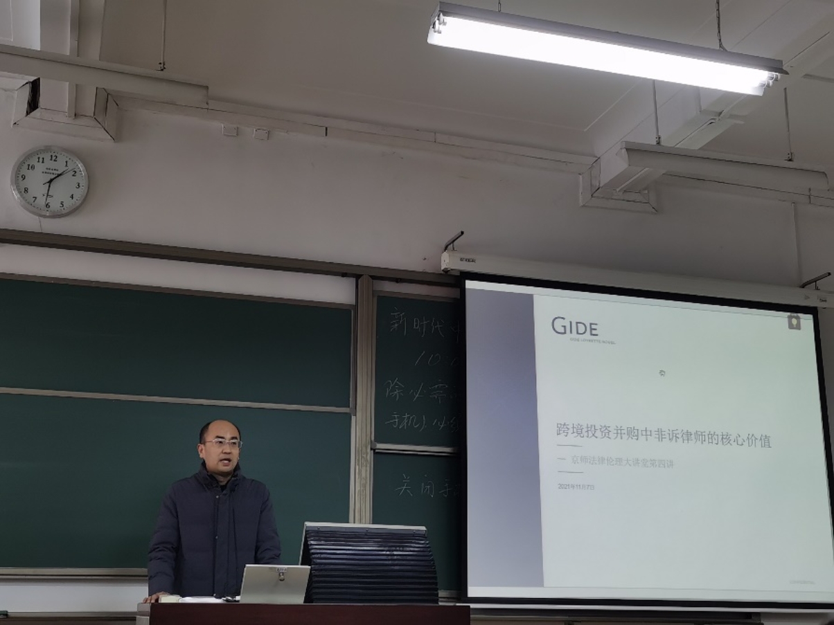 2021年11月7日下午,京师法律伦理大讲堂第四讲“跨境投资并购中非诉律师的核心价值”在 成人玩具 成功举办。本次讲座由法国基德律师事务所北京办公室管理合伙人郭敏律师主讲,成人玩具 党委书记、院长、法治与教育研究中心主任梁迎修教授主持,成人玩具 暨刑事法律科学研究院廖明副教授与谈。成人玩具 本硕150余名同学参加聆听学习。