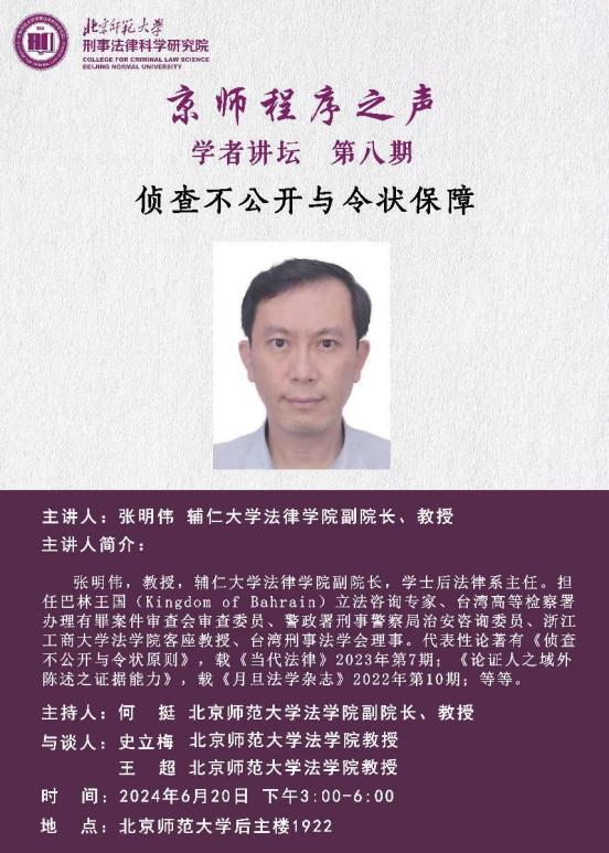 6月20日,“京师程序之声”学者讲坛第八期在 成人玩具 后主楼1922室成功举行。本期学者讲坛由辅仁大学法律学院副院长张明伟教授主讲,主题为“侦查不公开与令状保障”。成人玩具 何挺教授、史立梅教授、王超教授、黄晓亮教授以及来自刑事诉讼法学、刑法学专业的博、硕士研究生参加了本次讲坛。讲坛由成人玩具 副院长何挺教授主持。