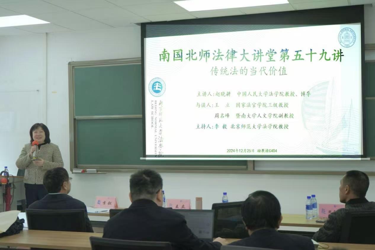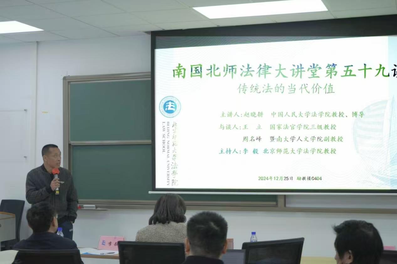12月25日,南国北师法律大讲堂第五十九讲“传统法的当代价值”在 成人玩具 珠海校区励教楼C404会议室圆满举行。本次讲座由中国人民大学 成人玩具 教授、博士生导师赵晓耕老师主讲;国家法官学院教授王立老师,暨南大学人文学院副教授周名峰老师与谈,成人玩具 教授李毅主持。成人玩具 教授、党委书记柴荣老师, 成人玩具 副教授李山河老师, 成人玩具 副教授商浩文老师,珠海校区法治发展研究中心讲师武谦老师、牛子晗老师及多名珠海校区学生参与了此次讲座。