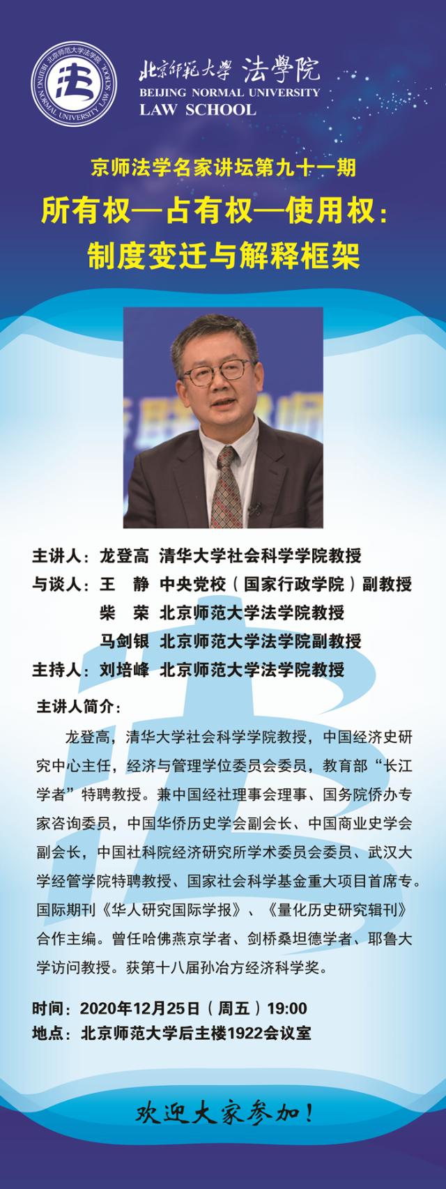 【12.25】京师法学名家讲坛第九十一期---所有权—占有权—使用权:制度变迁与解释框架/主讲人:龙登高