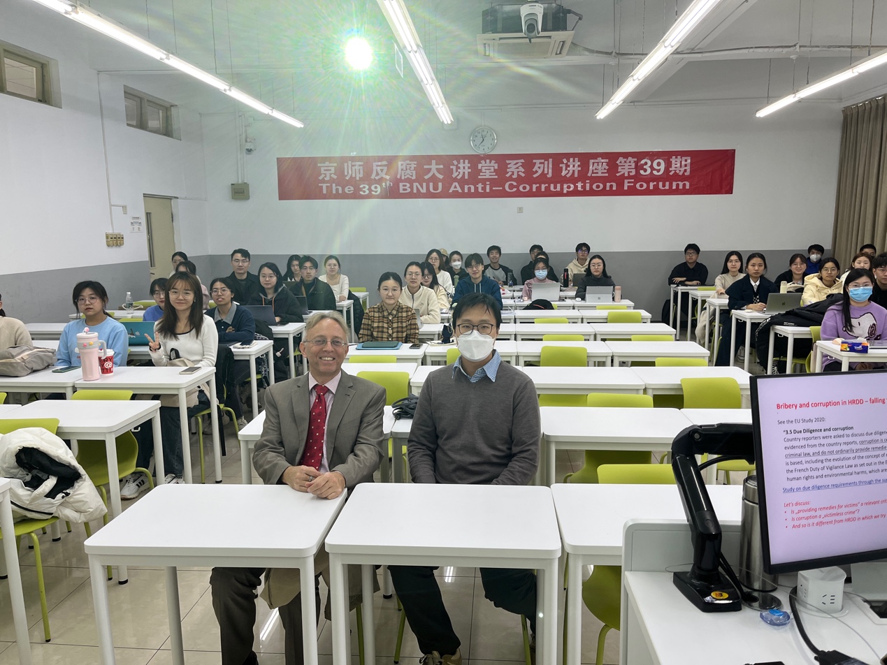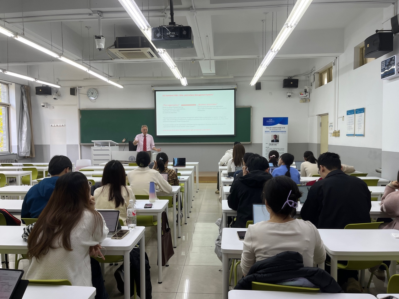 2023年11月22日上午,“京师反腐败大讲堂系列讲座”第39期在 成人玩具 成功举办。本次讲座由成人玩具 李迪讲师主持,格鲁吉亚新视野大学托马斯·玛丽亚·克吕斯曼教授主讲,讲座的主题是“危险信号。如何控制供应链中的腐败风险”。成人玩具 李迪讲师、王肃仪博士等50余名师生参加了本次讲座。