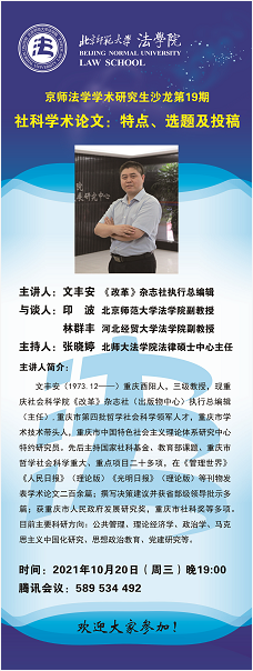 【10.20】京师法学学术研究生沙龙第19期——社科学术论文:特点、选题及投稿/主讲人:文丰安