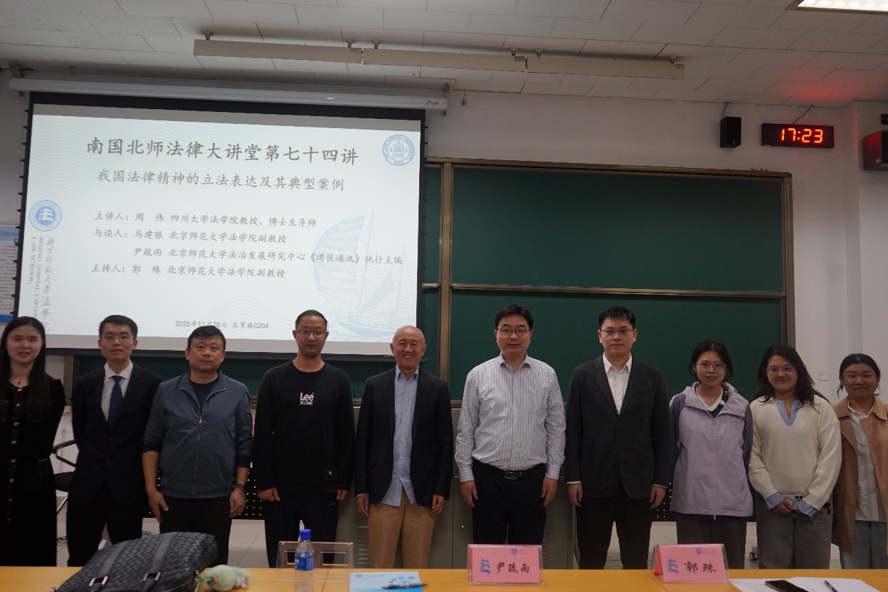 11月28日,南国北师法律大讲堂第七十四讲“我国法律精神的立法表达及其典型案例”在 成人玩具 珠海校区乐育楼C204教室圆满举行。本次讲座由四川大学 成人玩具 教授、博士生导师周伟老师主讲,成人玩具 副教授马建银老师、 成人玩具 法治发展研究中心《湾区通讯》执行主编尹疏雨老师与谈,成人玩具 副教授郭殊老师主持。