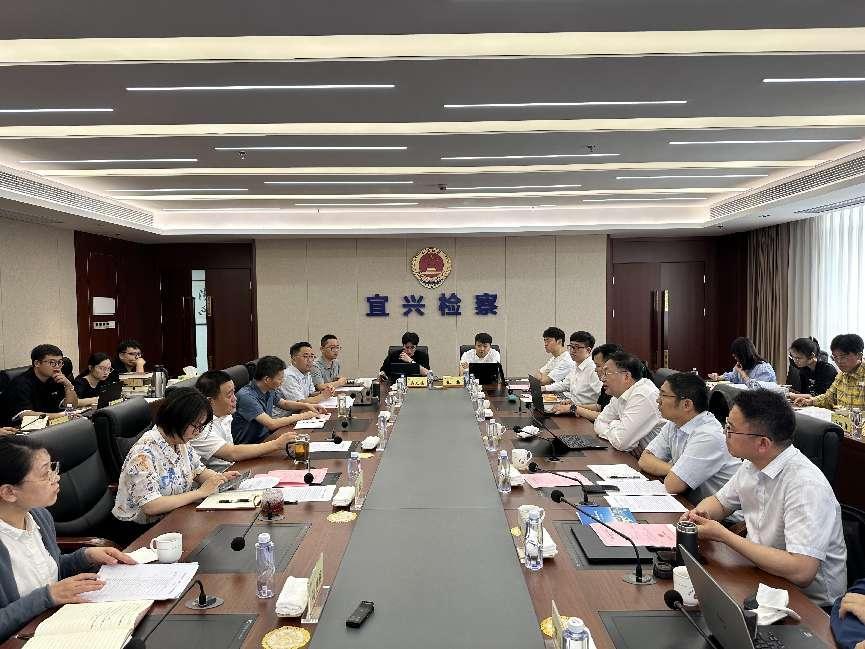 5月26日上午,课题组在宜兴市人民检察院进行调研座谈。座谈会由宜兴市人民检察院党组书记、检察长张志钢同志主持。宜兴市人民检察院的有关同志首先介绍了近年来该院依托无人机、大数据等先进技术,在数字化公益损害防控方面取得的突出成绩。随后,检察部的有关同志结合该院办理的企业合规典型案例,向考察团介绍了宜兴检察院在公益损害防控和企业合规实践中遇到的疑难问题。黄晓亮教授科研团队、时延安教授科研团队,就企业合规案件二元化处理的正当性、宜兴市公益损害风险防控与企业合规工作模式等问题,与该检察院有关办案同志进行了交流讨论。