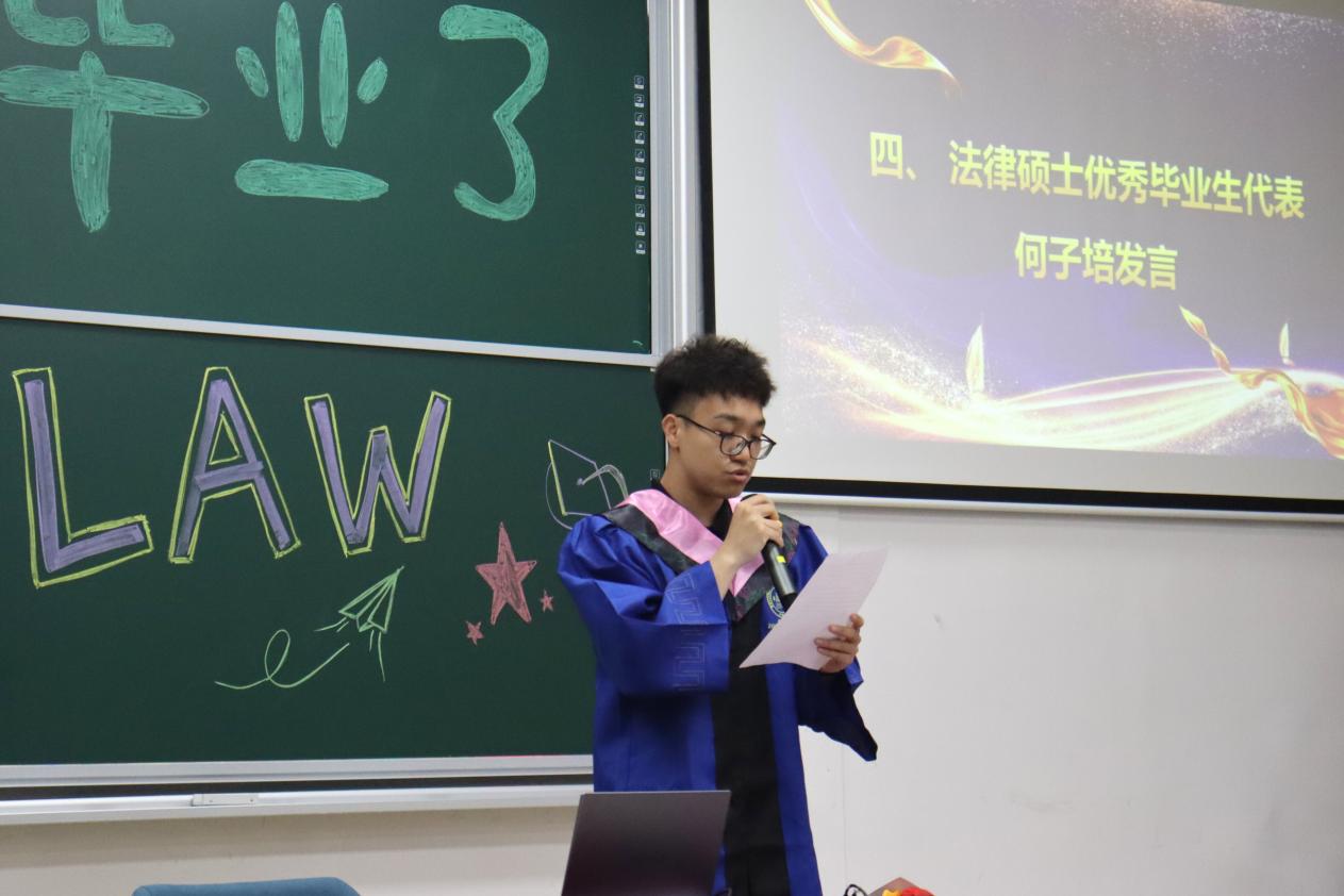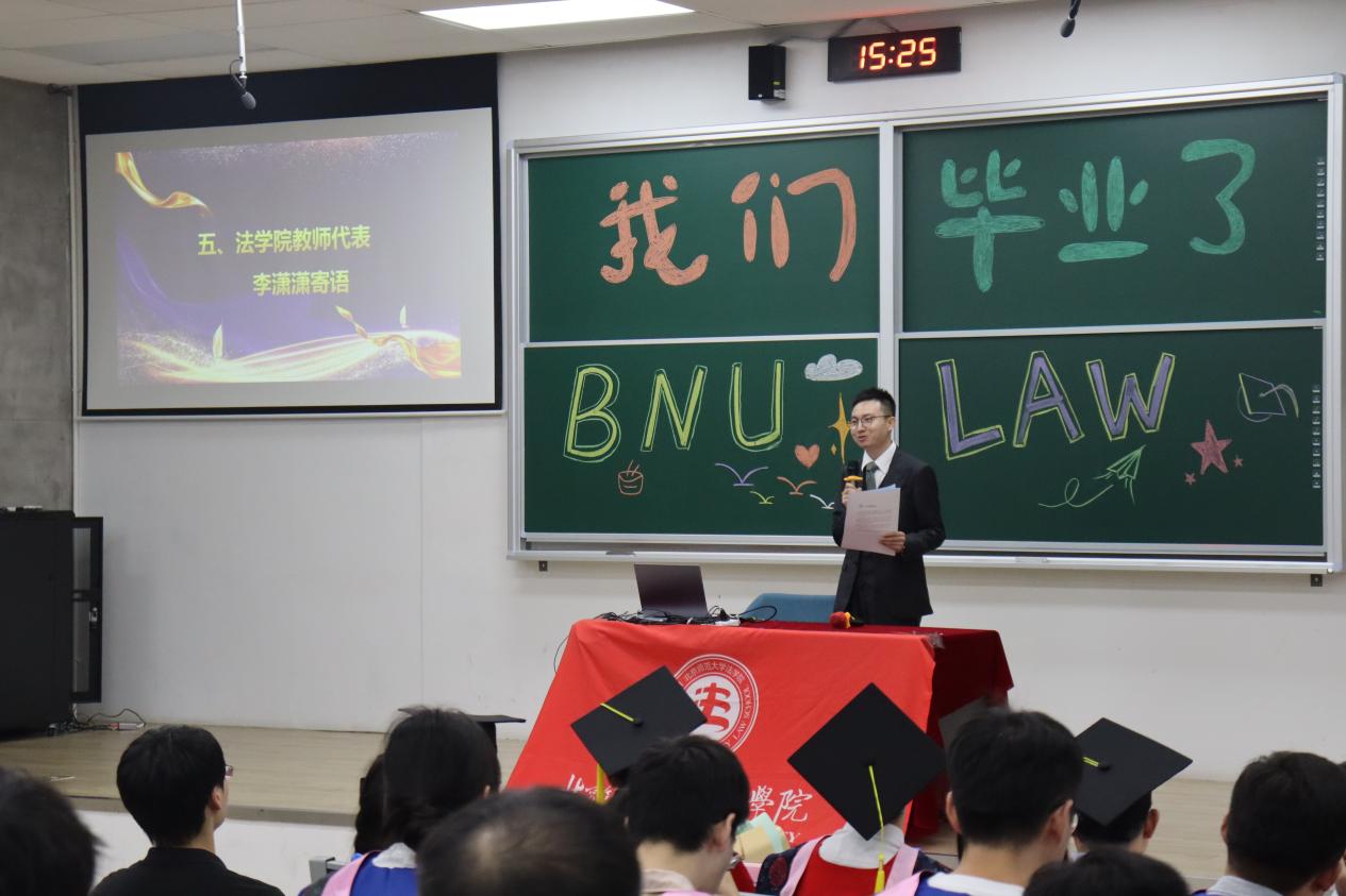 颁奖环节过后,2023届法律硕士何子培代表毕业生发表感言,表达了对 成人玩具 老师们殷殷教诲的感恩之情及对学院和同学们的惜别不舍。教师代表李潇潇为毕业生送上寄语,鼓励同学们在未来的人生道路上“遵从内心认同”但“接受事与愿违”。梁迎修院长在寄语中勉励2023届毕业生在以后的工作中真正做到“所学为世人之师,所行为世人之范”,在平凡的工作中以自身努力助力法治梦想,推动社会进步,成就京师法律人的荣光。