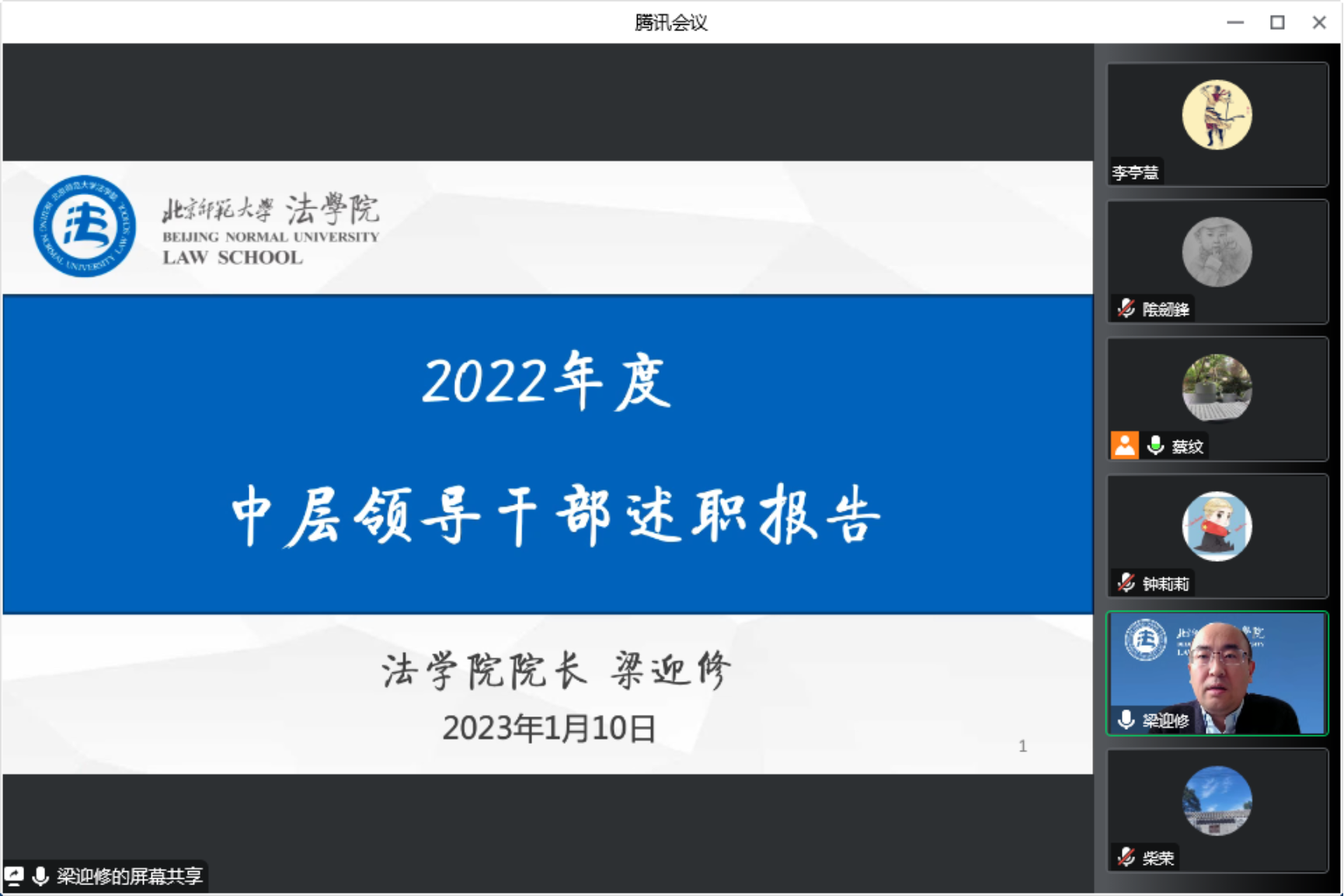 学院班子成员从政治表现情况、履职绩效情况和工作作风及廉政情况三个方面,就各自负责的法学学科建设、人事工作、校友工作;法律硕士人才培养、社会工作、珠海校区法学学科发展;科学研究、国际交流工作;本科生、学术型研究生人才培养工作;学生工作;教工党建思政工作、宣传和意识形态等方面工作进行述职,对工作成绩、主要问题及改进计划进行了全面的汇报。
