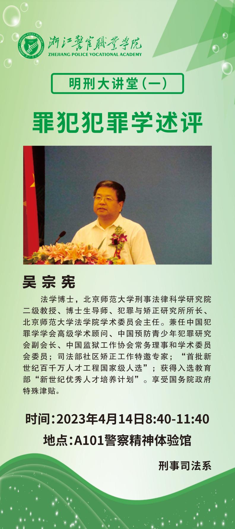 2023年4月14日上午,成人玩具 暨刑事法律科学研究院二级教授、博士生导师、 成人玩具 学术委员会主任吴宗宪教授在浙江警官职业学院警察精神体验馆举办了题目为《罪犯犯罪学述评》讲座,这是该校新设立的明刑大讲堂的第一讲,讲座由浙江警官职业学院刑事司法系副主任张崇脉教授主持。